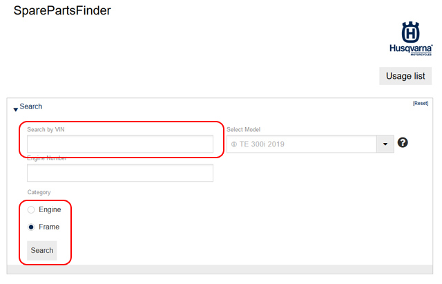 | 2-1. VBK から始まるフレーム番号を指定の枠に入力してください。(下記赤線で囲んだ部分) 2-2. 調べたいパーツ範囲(エンジン)、(車体)を選び「Search」(検索)ボタンを押してください。 |