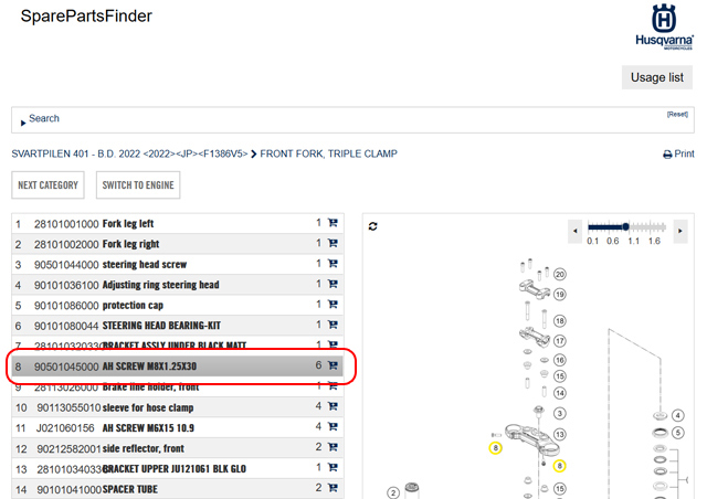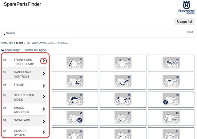 | 3. お探しのパーツを、左の項目または車体シルエットのアイコンから検索し、 見つかった項目をクリックすると構成図とパーツの品番を確認することができます。 |