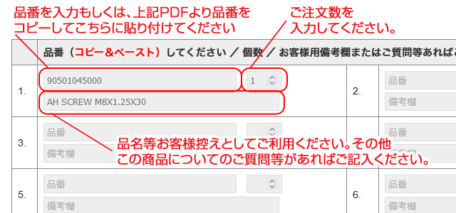 | 2. 申し込みフォームに品番をコピー&ぺーストして送信してください。 ※必ずコピー&ペーストしてください。品番の入力間違いによる商品の返品交換はできませんので、ご注意ください。 |
